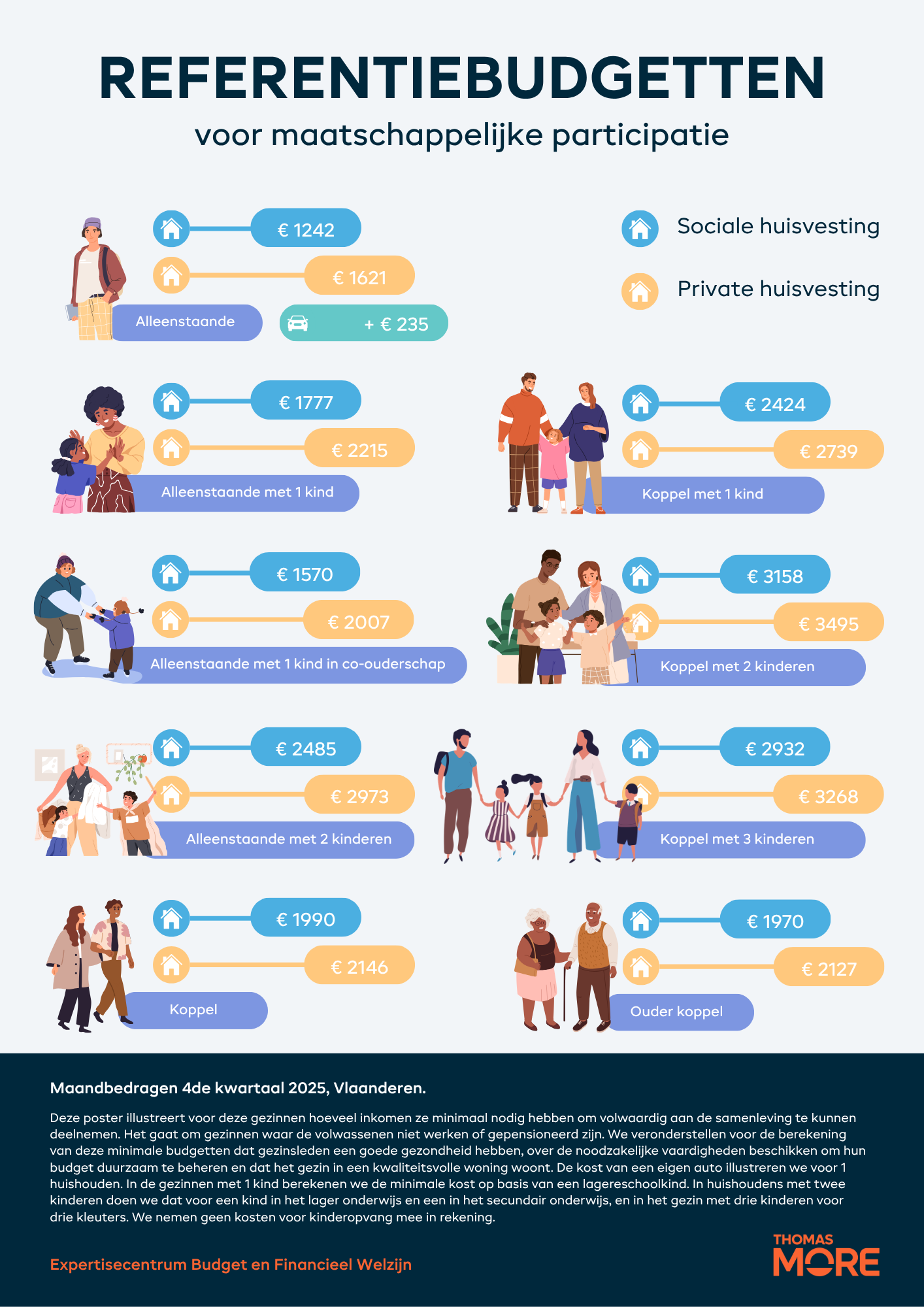 Referentiebudgetten doen een uitspraak over hoeveel geld een gezin nodig heeft om te kunnen deelnemen aan de samenleving. Omdat ieder gezin andere noden heeft, is het daarom moeilijk om één bedrag naar voren te schuiven. Om toch een idee te kunnen geven over de bedragen, gebruiken we ‘typegezinnen’. Dat zijn voorbeeldgezinnen in verschillende samenstellingen, die aan enkele voorwaarden voldoen. De afbeelding hiernaast toont deze voorbeeldgezinnen.